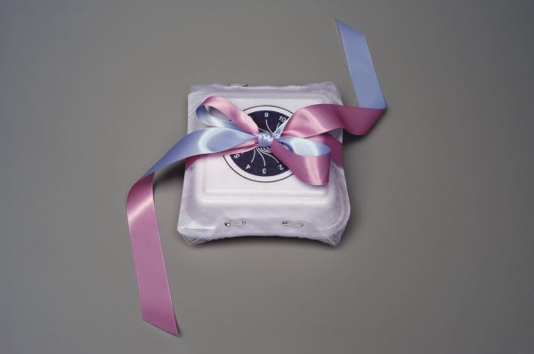 Closed (2003) Click "previous" above to see the Casquette interior. The sculpture depicted comprises one DVD video of Creamistress 6: "TheCentered Polenta," a styrofoam take-out box, marshmallow creme, a portion of the veiling used in the video to veil the Creamistress, Mira Fibbah, and other media. Edition of five and one A.P. For more information regarding the print or the sculpture, please contact carolyn(a)c-cyte.com. |