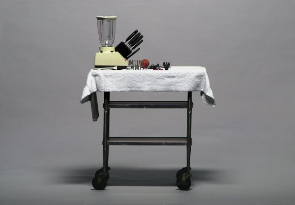 Digital print, 16-1/2 x 11-1/2", edition of five (5). The sculpture shown comprises cart, blender, knives,